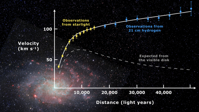 About 25% of our universe is made up of ‘dark matter’. It is called ‘matter’ because it interacts gravitationally with other massive particles and ‘dark’ because it does not emit any radiation we can detect. There are numerous ways we know dark matter exists. The first hints of dark matter came from galactic rotation curves, observed by Vera Rubin. Most of the visible matter in a galaxy is concentrated at the center. From Newtonian mechanics, we expect that as one gets away from the center, the rotational velocity of stars to get smaller. However this is not what is observed! Stars have the same (sometimes higher) velocity regardless of their distance from a galactic center. This means there is some extra gravitation force helping the stars go faster. This extra force can be explained with the existence of dark matter, distributed around a galaxy. Other experimental hints of dark matter include the Cosmic Microwave Background and the bullet cluster.