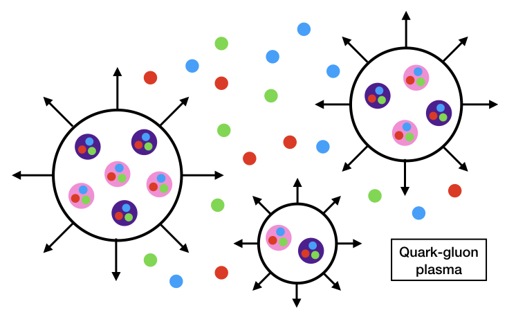 My 2019 paper, published in PRL, proposes another novel way to address this question. Here we explore the possibility of changing the strong interactions in the early universe. New particles that interact with the gluon field can change the strength of the strong interactions in the early universe. We propose a scenario where the quarks and gluons confine into protons and neutrons (hadronic phase) at a temperature of ~TeV, much higher than what is expected in the Standard Model (~GeV). In such a universe, this confinement transition is a 1st order phase transition and proceeds via ‘bubble nucleation’. Bubbles of the hadronic phase start forming within the quark-gluon plasma phase. These bubble grow and merge with each other and eventually fill out the whole universe. Bubble nucleation can happen out of thermal equilibrium, satisfying one of the Sakharov conditions. There can also be large CP violation in the strong sector, via the axion. Finally, baryon number is violated via weak interactions at these high temperatures. Hence the observed matter-antimatter asymmetry is produced during the phase transition.