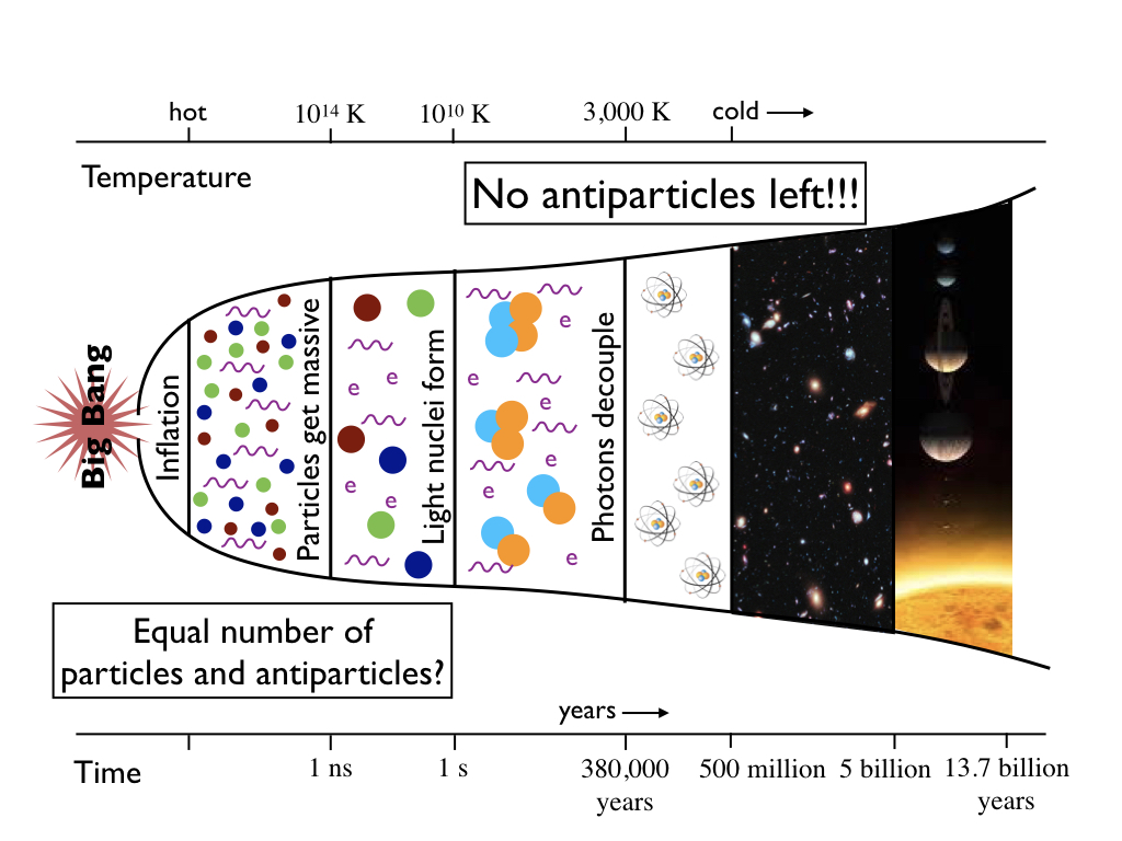 Observations tell us that there is no antimatter in our universe. However, if we believe the Standard Model, we expect that there should have been equal amounts of matter and antimatter at the beginning. What happened to the antimatter? How did it disappear? When did it disappear? In order to answer these questions we need to go beyond the Standard Model.